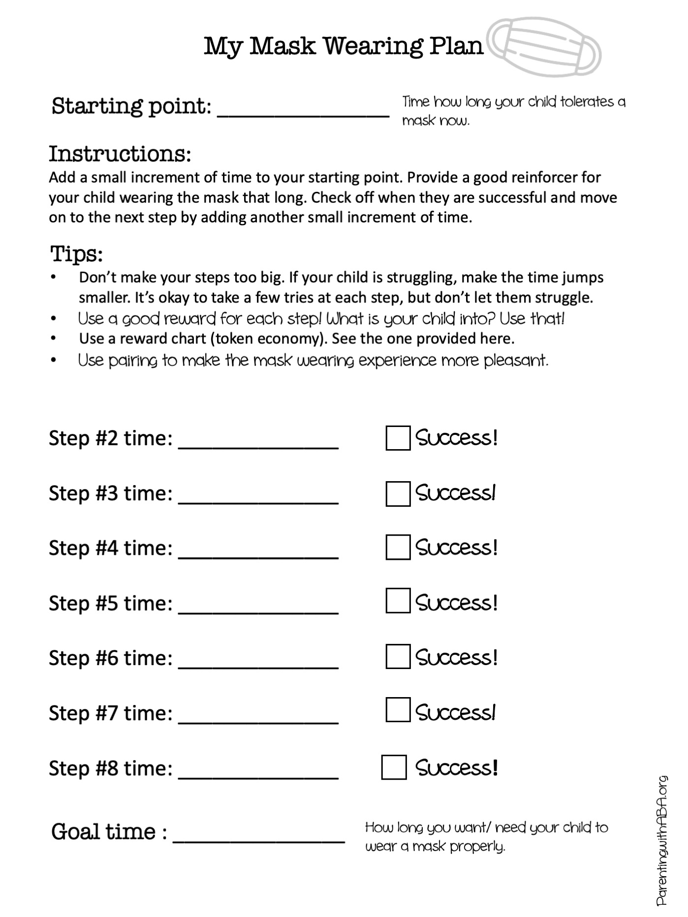 4. Give positive reinforcement for wearing the mask properly. You can use another legit tool called the premack principle. “First wear your mask nicely, then you may ___.” Give them a reward for wearing the mask. Learn more about the premack principle here.