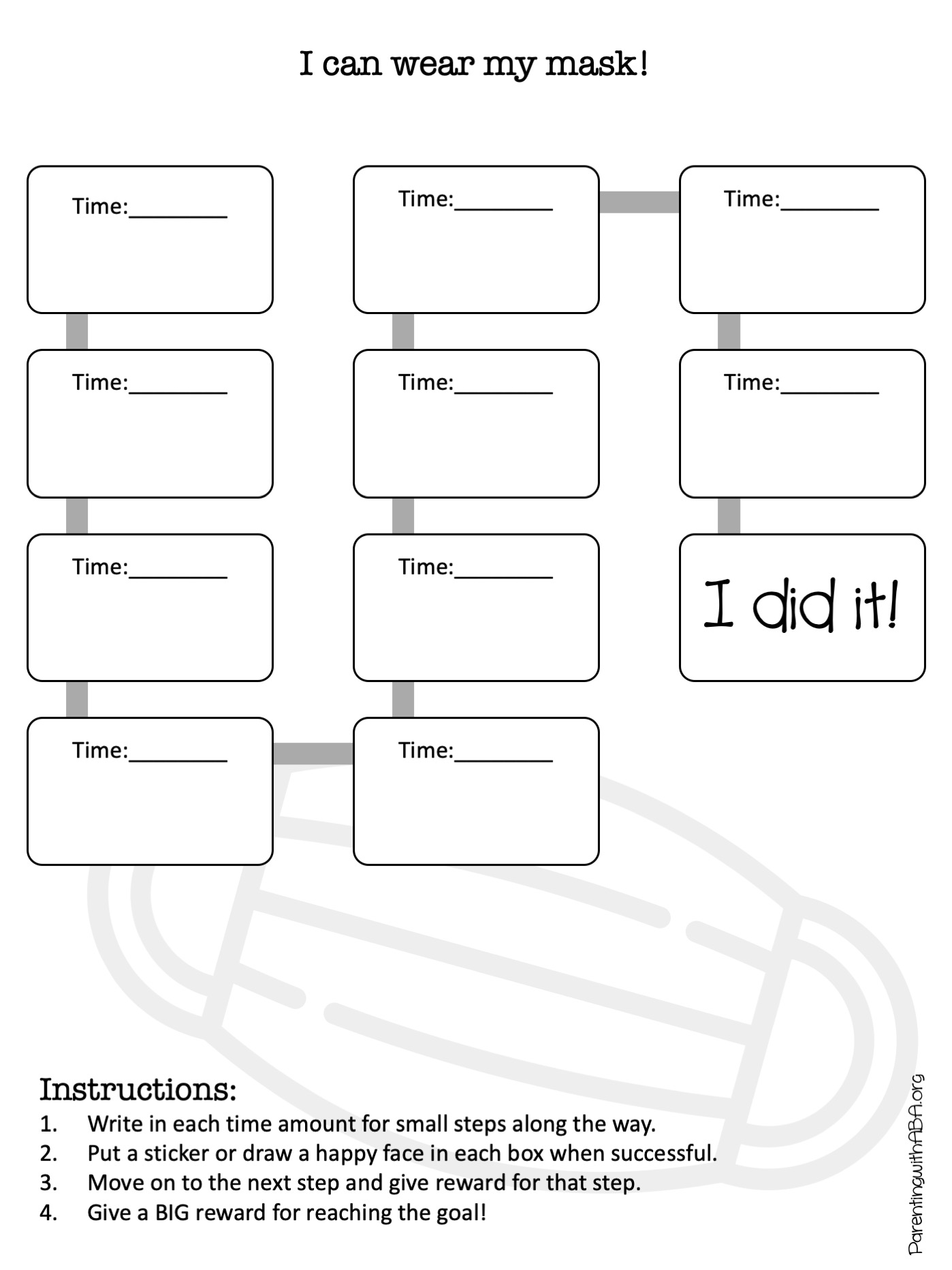 So how long can your child wear a mask now? 1 minute? 1 hour? Not sure? Try it out and see. We’ve got timers & stopwatches built into our watches, phones, Alexa- whatever. It’s really easy to time them.  This is your starting point.