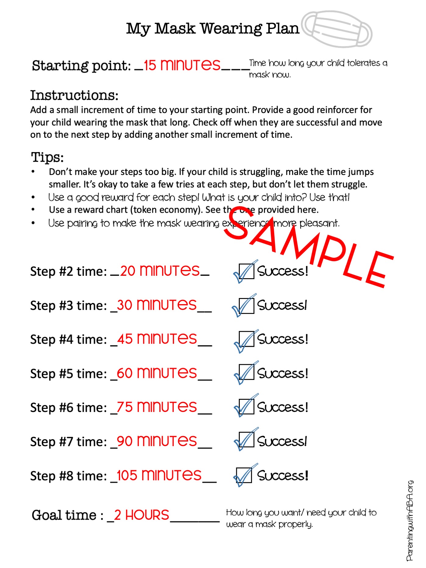 Add a little bit of time to your starting point. Give your child a reward for wearing the mask for that long. Did they do it? No? Then stay here and try again later to give a reward for wearing the mask for this amount of time. If they did it successfully, add a little more time next practice round and the reinforcement comes for making it just a little longer with the mask.